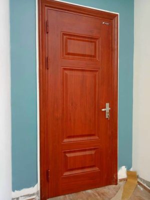 Cửa thép vân gỗ có lõi thép chắc chắn, bề mặt sơn tĩnh điện vân gỗ.
